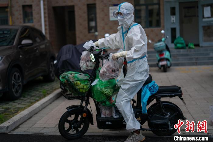 防疫志愿者逐個(gè)為居民派送蔬菜水果等生活物資。江飛波 攝