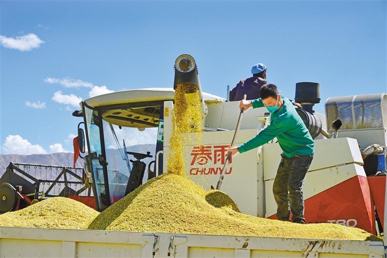 9月19日,日喀則市江孜縣熱索鄉努康村村民次仁多杰正在用大型收割機收獲青稞。次仁多吉 記者 扎西頓珠 攝