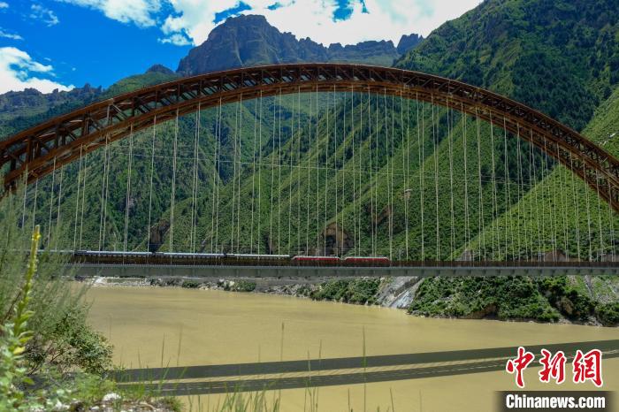 圖為一列火車經過西藏雅魯藏布江藏木大橋?!〗w波 攝