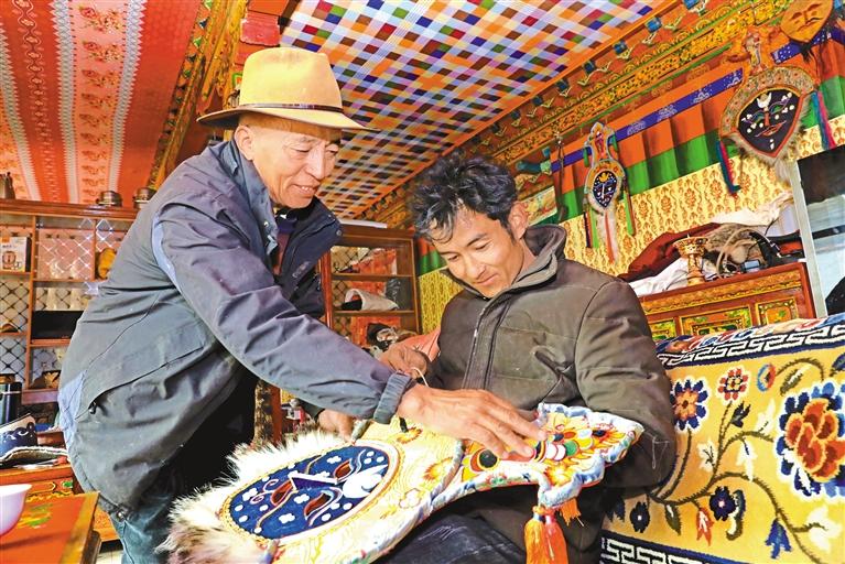 圖為拉薩市非物質文化遺產傳承人、墨竹工卡縣達普林耐傳統服飾制作技藝第五代傳承人加措(左)向徒弟教授面具制作技藝。記者 潘多 攝