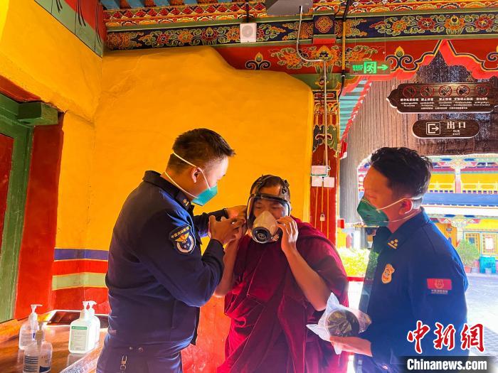 圖為消防員指導僧人學習佩戴防煙防毒面具。 拉薩市消防救援支隊供圖