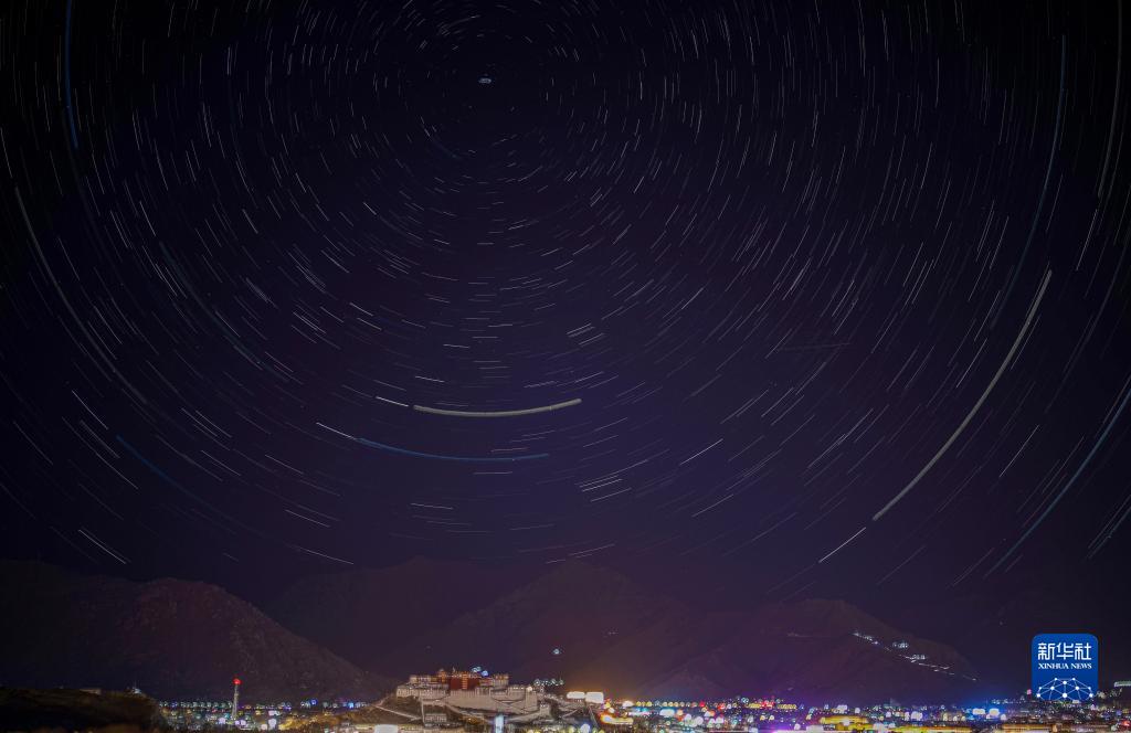 這是在拉薩市南山公園拍攝的以布達拉宮為前景的星軌照片(合成照片,11月21日攝)。新華社記者 姜帆 攝