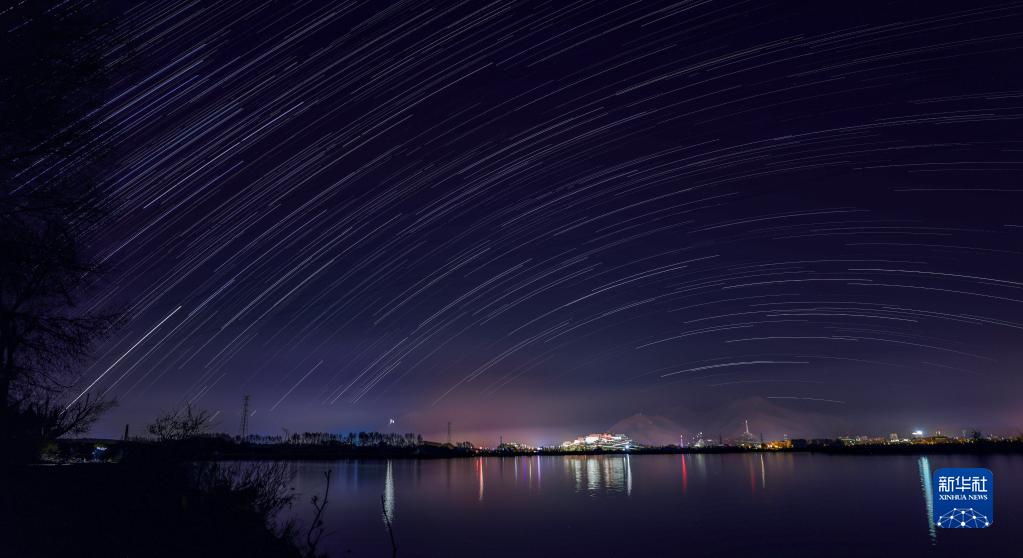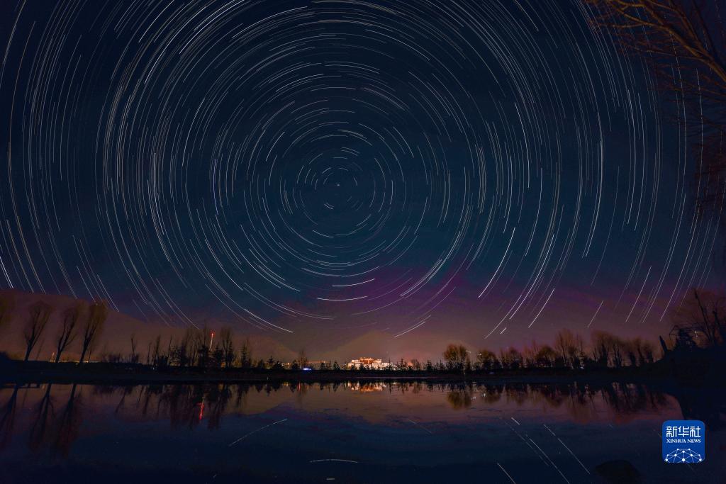 這是在拉薩市拉魯濕地拍攝的以布達拉宮為前景的星軌照片(合成照片,11月26日攝)。新華社記者 姜帆 攝
