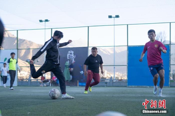 圖為12月12日,拉薩市城關(guān)區(qū)仙足島室外足球場(chǎng)里,市民正在踢球。中新社記者 貢嘎來(lái)松 攝