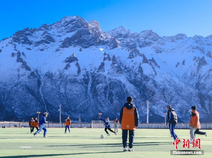 圖為11月25日,西藏那曲市嘉黎縣中學(xué)學(xué)生們?cè)凇把┥较碌膲?mèng)幻足球場(chǎng)”上進(jìn)行足球訓(xùn)練。中新社記者 貢嘎來(lái)松 攝