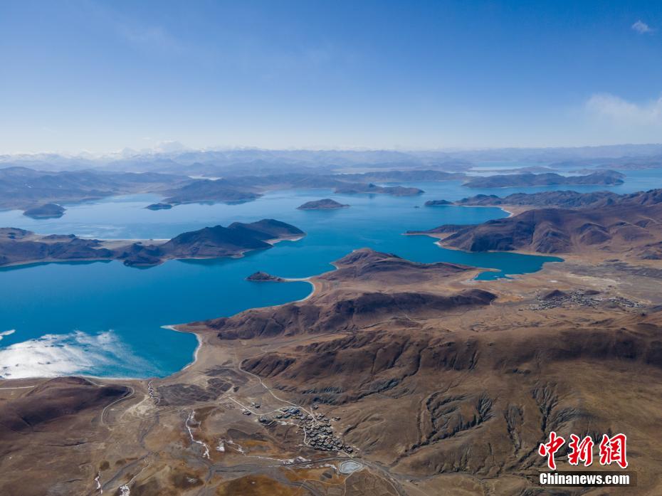 近日,西藏自治區(qū)山南市羊卓雍錯(cuò)(簡稱羊湖),冬日由于沒有云層遮擋,湖水更顯深藍(lán)、孔雀藍(lán)。航拍視角下,湖水像巨大的寶石鑲嵌于高原大地,風(fēng)光壯麗。羊卓雍錯(cuò)藏語意為“碧玉湖”,湖面海拔4441米,與納木錯(cuò)、瑪旁雍錯(cuò)并稱西藏三大“圣湖”。圖為羊湖著名景點(diǎn)日托寺。 江飛波 攝