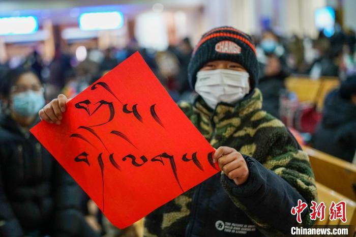 圖為春運首日,拉薩火車站一旅客獲得車站送的藏式春聯,上面書寫的是藏語“扎西德勒 吉祥如意”。 江飛波 攝