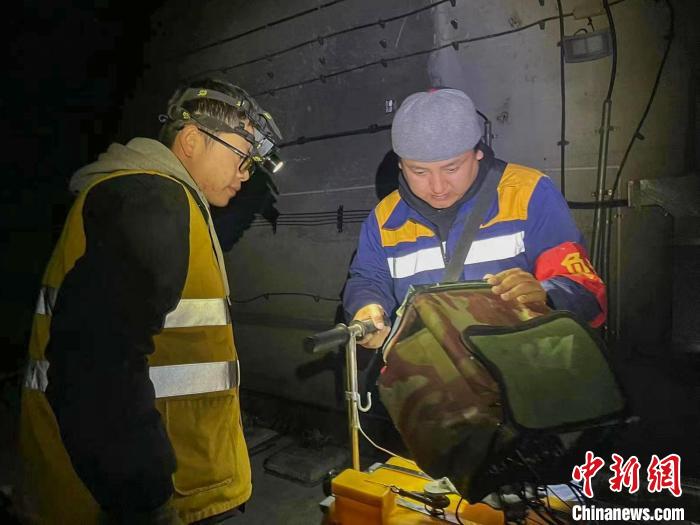 次旦平措(右)與同事深夜在拉林鐵路進行鋼軌探傷作業?!●R生明 攝