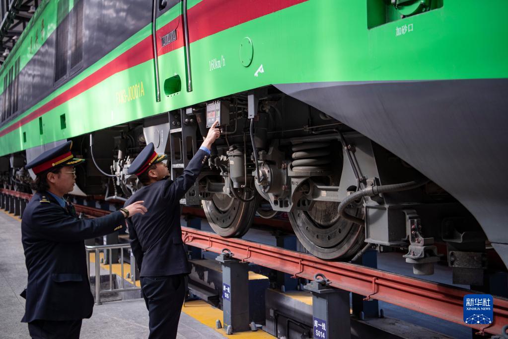 在拉薩機輛整備中心,黃起崗(右)和同事對動車組進行走行部檢查(1月11日攝)。新華社記者 孫非 攝