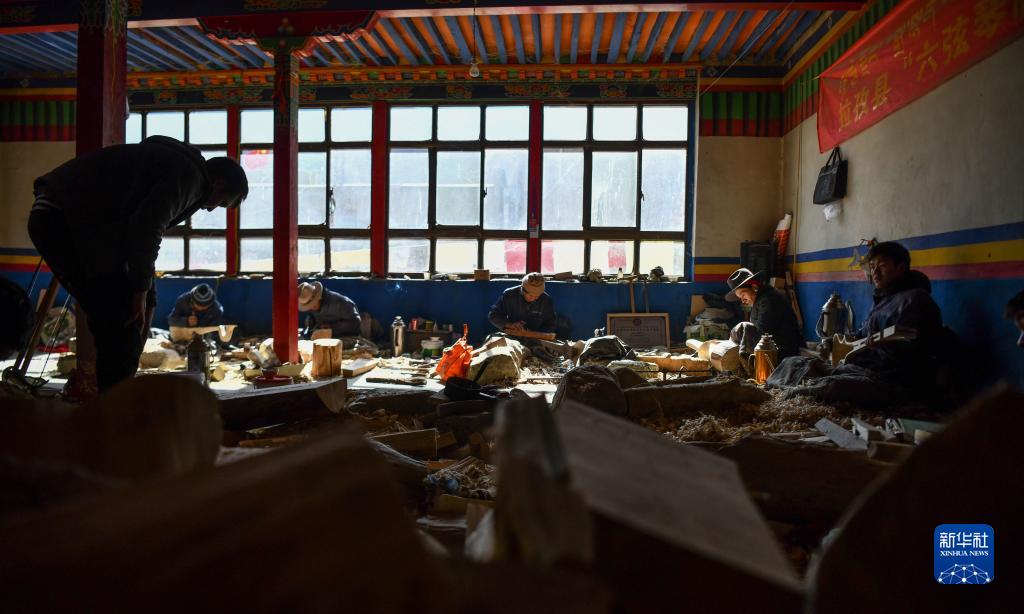 索朗瓊拉的大兒子在制作扎念琴(1月19日攝)。新華社記者 晉美多吉 攝
