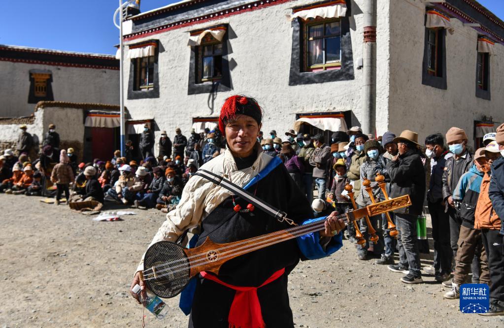在西藏日喀則市芒普鄉普村的“村晚”現場,演員手持扎念琴準備表演傳統節目(1月21日攝)。新華社記者 晉美多吉 攝