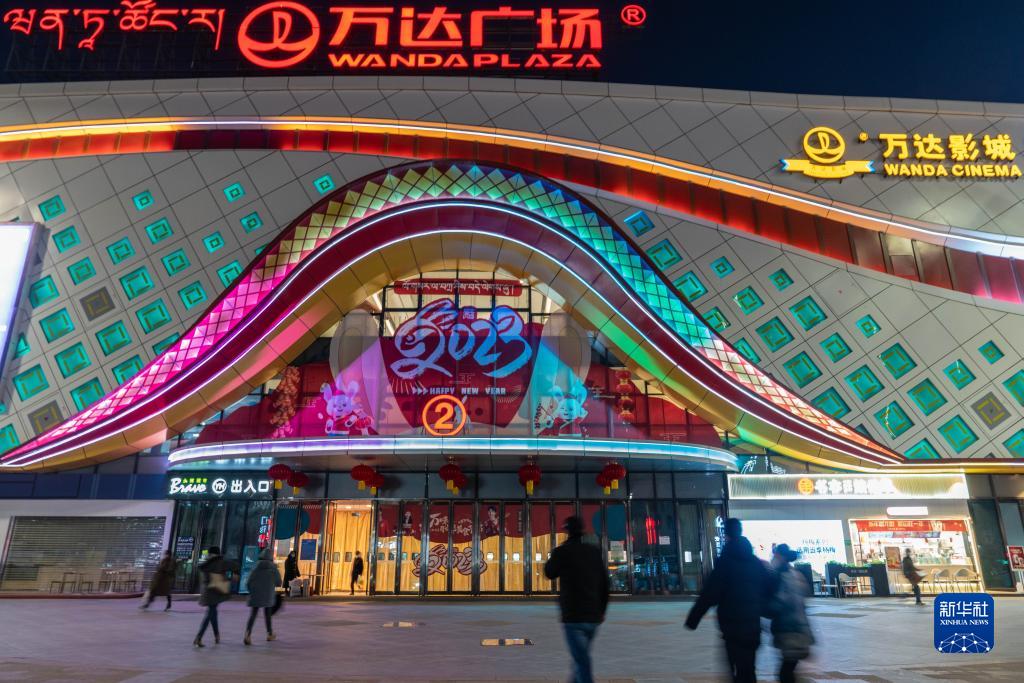 新年到來,拉薩城關萬達廣場商圈的樓宇外墻貼上了迎接2023年的喜聯,掛上了燈籠等裝飾品,喜慶氛圍濃厚。