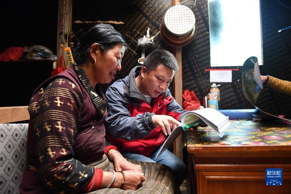 山南市社保工作人員在央宗家中為她補充登記社保信息,并介紹社保政策(2018年5月24日攝)。新華社記者 晉美多吉 攝