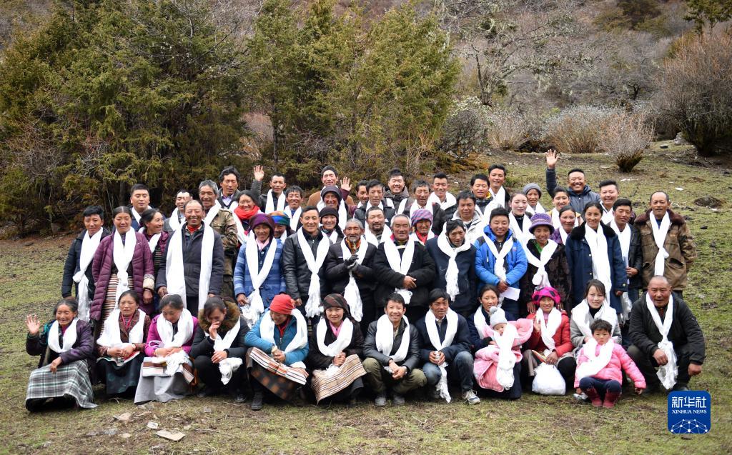 新遷入玉麥鄉的居民代表與卓嘎、央宗等合影(2019年4月9日攝)。新華社記者 晉美多吉 攝
