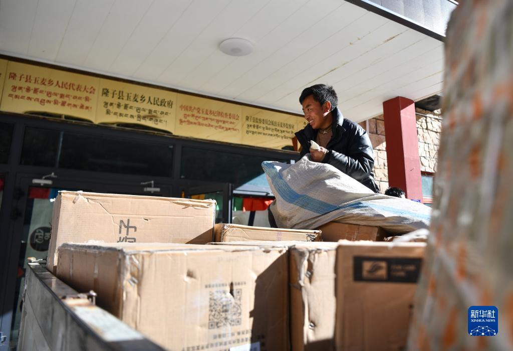 玉麥鄉郵遞員在搬運剛剛抵達玉麥的快遞包裹(2023年1月8日攝)。新華社記者 晉美多吉 攝