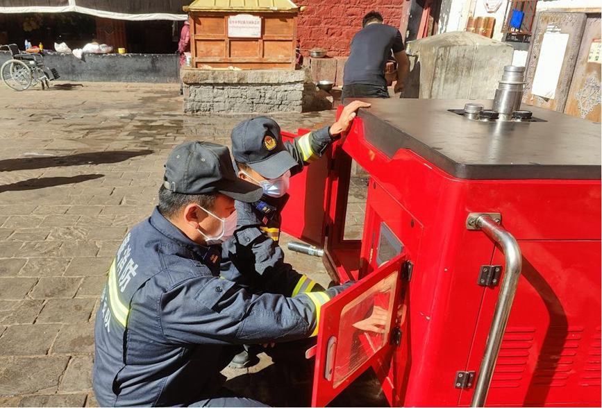 圖為檢查消防設(shè)備。圖片由布達(dá)拉宮消防救援大隊(duì)提供