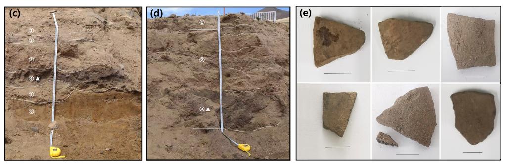 圖(c)(d)分別為共塘遺址調查剖面1和剖面2地層(三角形表示陶片位置)。圖(e)為本研究所分析的陶片照片。(資料圖片由第二次青藏科考隊“人類活動歷史及其影響”分隊提供)