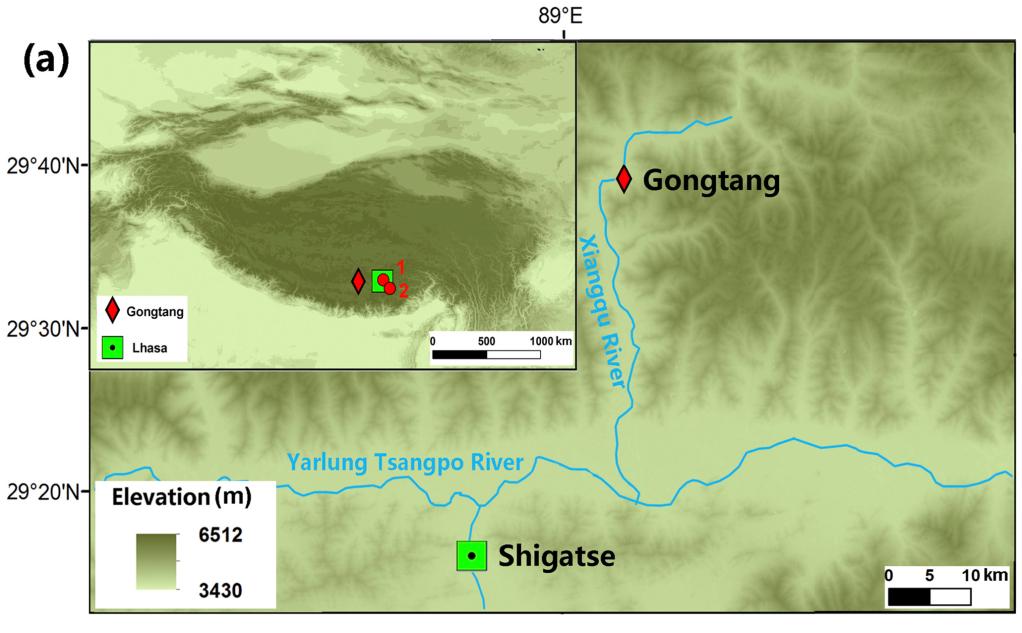 圖(a)為雅魯藏布江中游部分地區遺址背景資料圖,曲貢(1)、邦嘎(2)和共塘遺址位置(紅色菱形所示)。(資料圖片由第二次青藏科考隊“人類活動歷史及其影響”分隊提供)