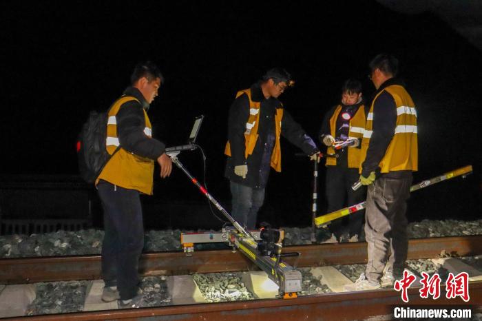 圖為2月9日晚,工作人員在西藏拉林鐵路線上進行設備檢查作業。 馬生明 攝