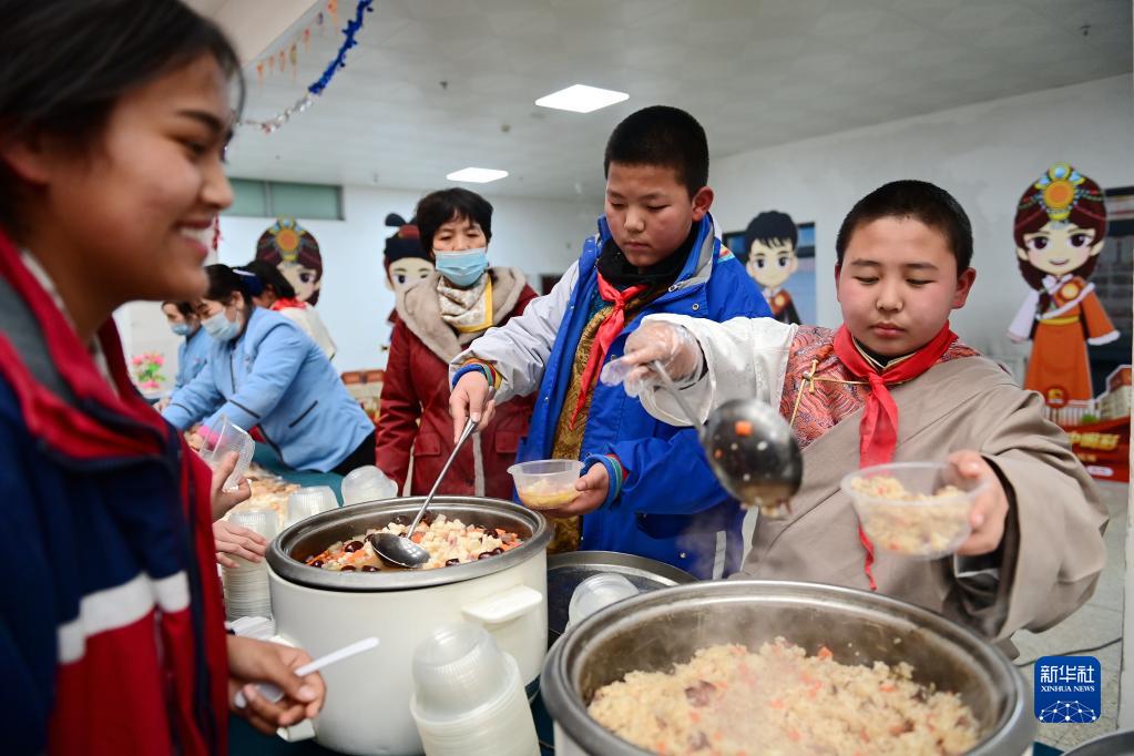 2月21日,在西安市浐灞第一中學舉行的藏歷新年團拜活動上,學生品嘗特色小吃。新華社記者 李一博 攝