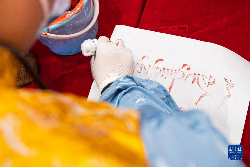 2月22日,西藏博物館工作人員將刻有“扎西德勒”的木刻印刷在紙上。新華社發(fā)(丁增尼達 攝)