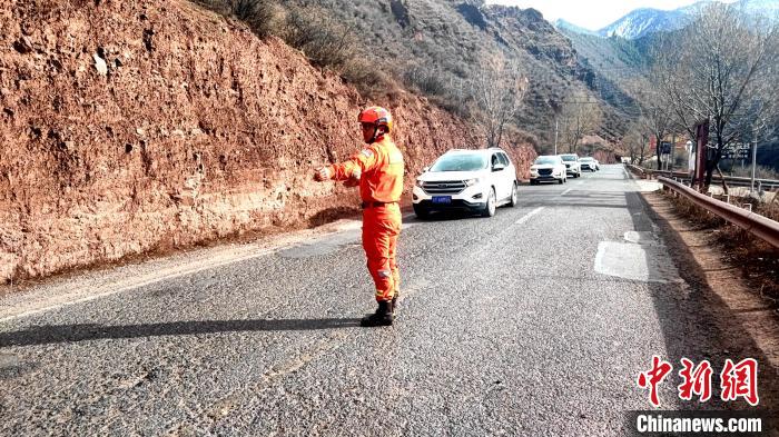 圖為昌都市卡若區森林消防中隊“火焰藍”志愿服務隊指揮過往車輛安全通行。 卡若區森林消防中隊“火焰藍”志愿服務隊供圖