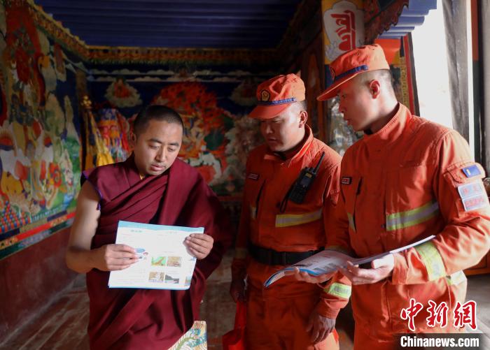 森林消防隊員正在為僧人講解防火知識?!∥骼@拉翁 攝