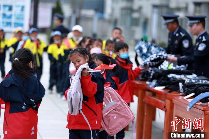 移民管理警察為學生發放書包,鼓勵學生好好學習,將來成為棟梁之材。 肖富貴 攝