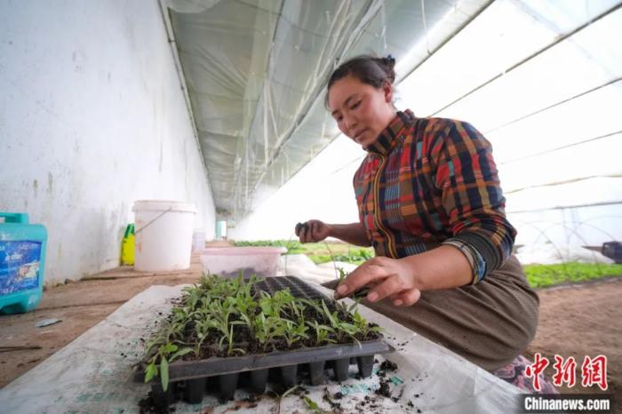 西藏阿里地區改則縣生態農牧業產業園溫室大棚內的工作人員正在進行育苗工作。何蓬磊 攝