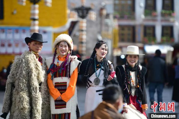 西藏拉薩,身著藏族傳統服飾的游客在八廓街拍照留念。貢嘎來松 攝