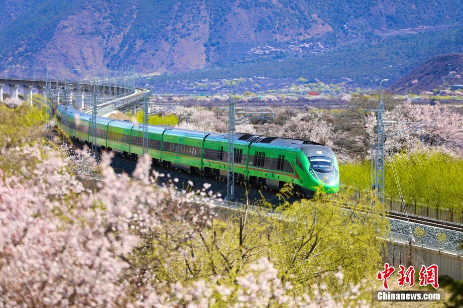 西藏拉林鐵路是一條連接西藏自治區拉薩市與林芝市的國鐵Ⅰ級單線電氣化鐵路,全長435公里,設計時速160公里,于2021年6月25日開通運營。圖為桃花、嫩柳與國槐綠涂裝的高原復興號。