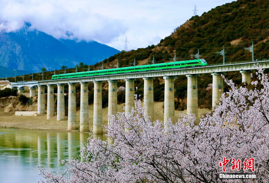 近日,中國鐵路青藏集團有限公司介紹,3月下旬至4月,拉林鐵路沿線綿延的野生桃花林盛開,藍天、白云、桃花、雪山、高原復興號動車等相互交織,形成了一幅幅美不勝收的畫面。圖為穿梭在桃花林中的拉林鐵路高原復興號。