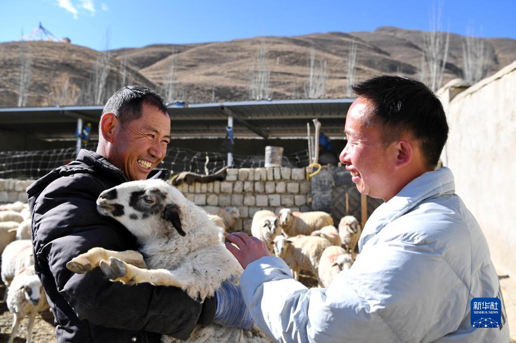 西卡學村養殖合作社負責人邊覺(左)在向西卡學村黨總支第一書記兼駐村工作隊副隊長李德林介紹綿羊養殖及銷售情況(4月5日攝)。新華社記者 張汝鋒 攝