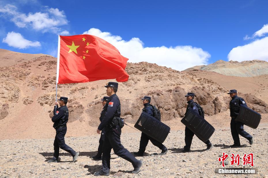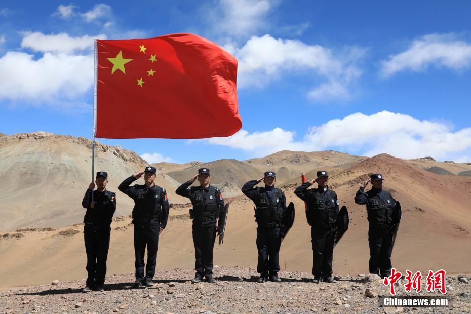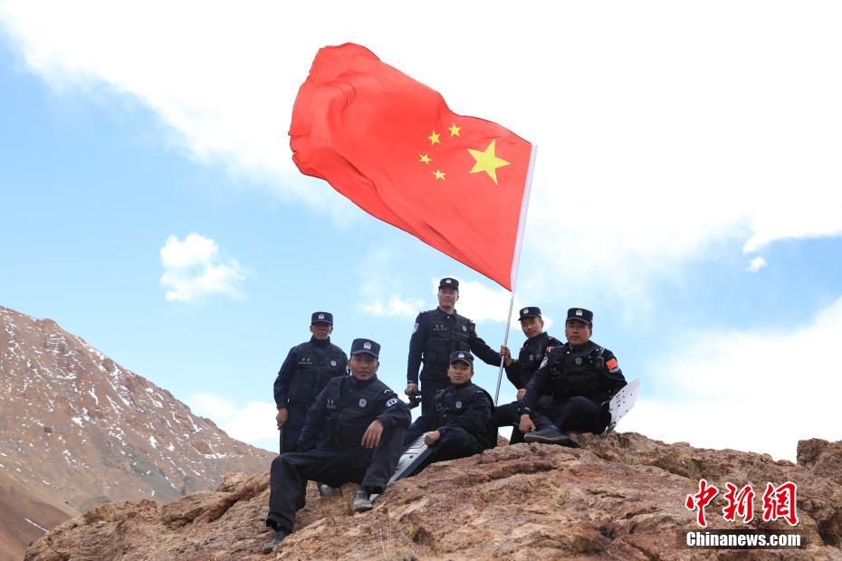 近日,西藏阿里邊境管理支隊扎西崗邊境派出所組織民警和護邊員通過乘車巡邏和徒步巡邏相結合的方式,前往海拔4800米的“守邊固邊第一村”——典角村古格川執勤點巡邏,經過一個小時的車巡和一個小時的徒步巡邏,民警到達了古格川執勤點。通過巡邏,及時掌握了邊境一線情況,確保了邊境轄區安全穩定。圖為民警與國旗合影。郭遠敬 攝