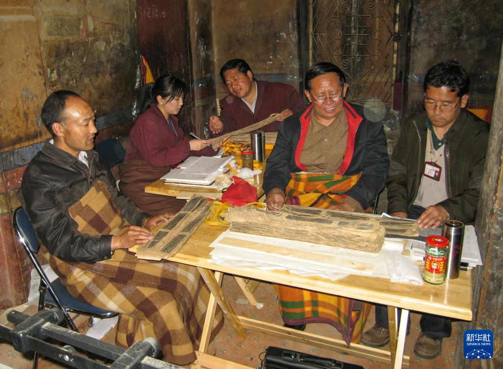 久米次成(左一)在布達拉宮整理館藏貝葉經(2008年5月12日攝)。新華社發