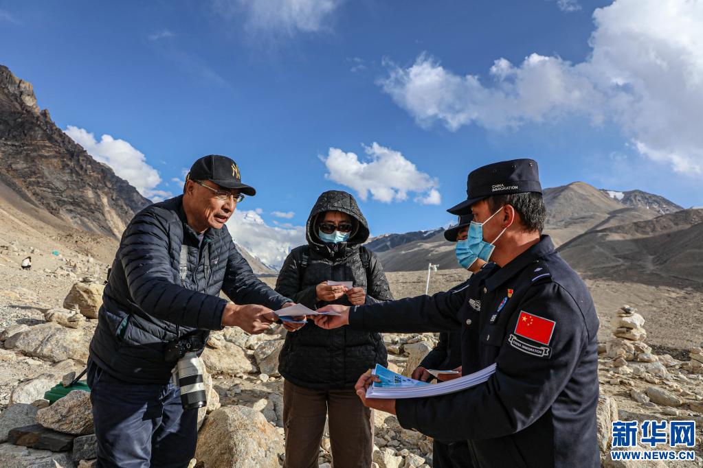 珠峰邊境派出所民警為景區游客發放安全注意事項宣傳單。