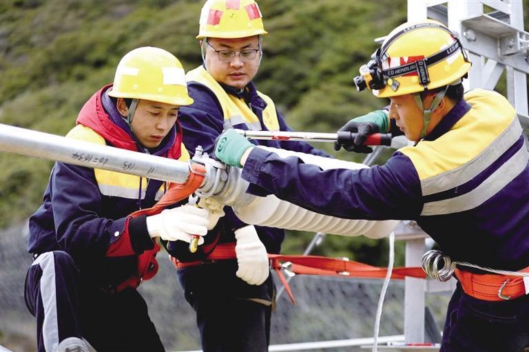 在接觸網支柱頂端,王偉雙手環抱著絕緣子,工友蔣瀟和次仁加布用專業套筒快速拆掉螺母,三人鉚足了勁合力將重達45公斤的絕緣子拆了下來。與此同時,次仁加布把舊絕緣子放在一邊,將新絕緣子送到位置,開始緊固、上端緊固到位、下端緊固到位……短短幾分鐘,他們就完成了絕緣子更換作業。望著自己的勞動成果,幾人臉上露出滿意的笑容。