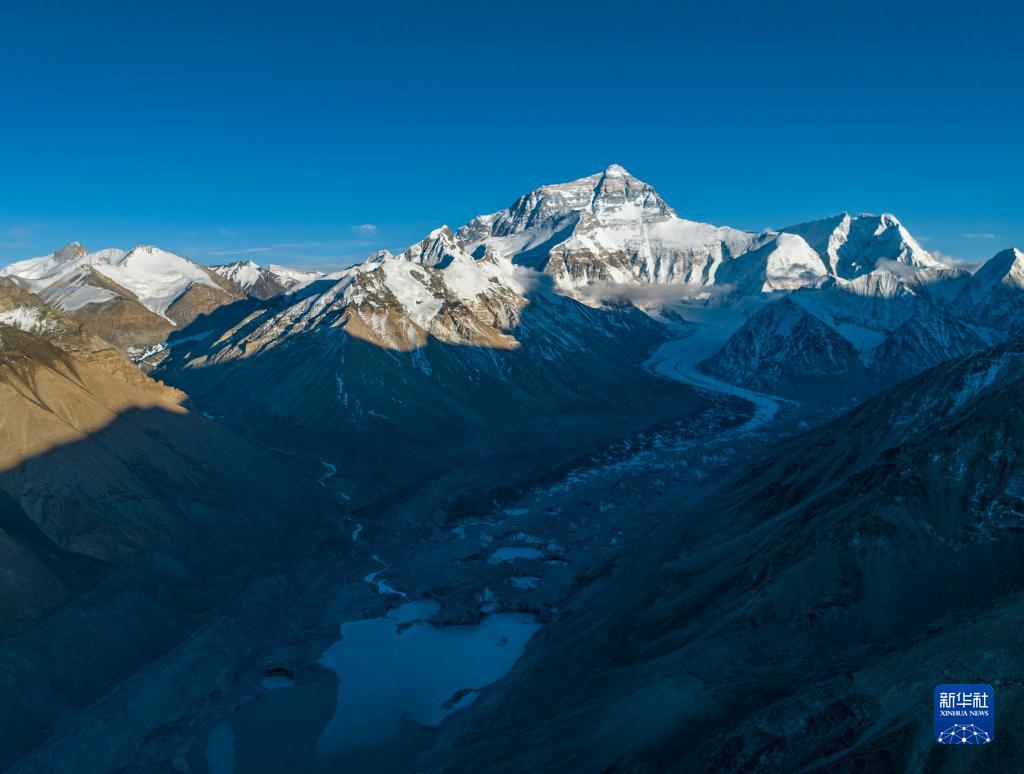 這是日落時分的珠峰和絨布冰川(5月16日攝,無人機(jī)照片)。新華社記者 晉美多吉 攝