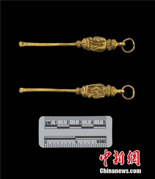 西藏自治區拉薩市當雄縣當曲卡鎮,當雄墓地出土的雄獅鳥紋金耳勺。國家文物局供圖
