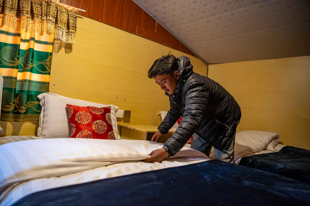 在珠峰游客大本營,旦增整理自家帳篷旅館的床鋪(5月13日攝)。新華社記者孫非 攝