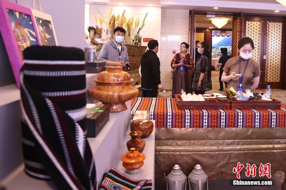 5月23日,“2023·中國西藏發(fā)展論壇”在北京舉行。會場外,活潑獨特的藏式迎賓舞蹈、展示西藏人文自然風貌的圖片,已在論壇開幕前預熱起探討西藏新發(fā)展的氛圍。圖為展臺上,布置著色彩豐富的藏式布匹、紙藝文創(chuàng)產品、藏香、酥油茶等。