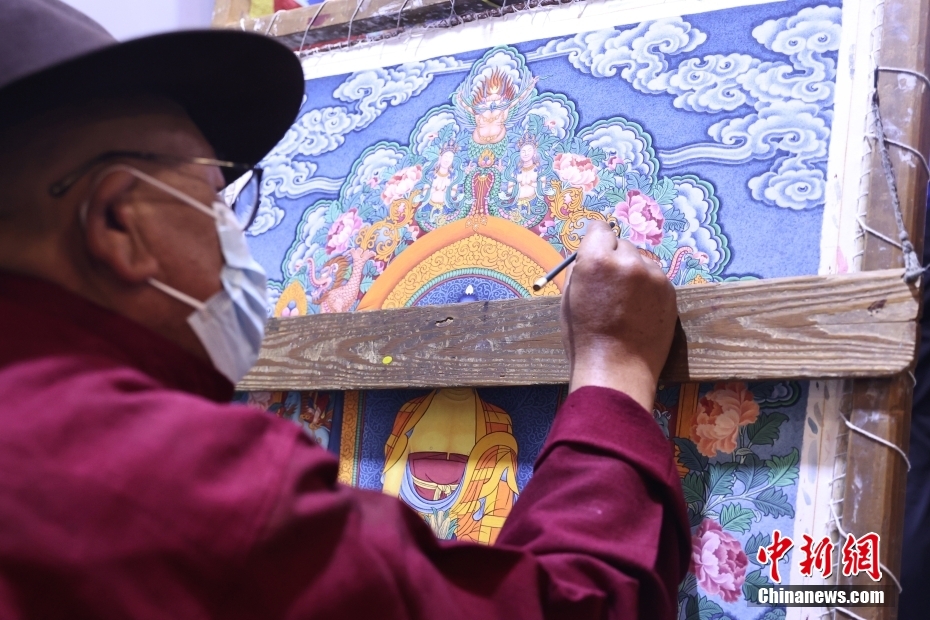 5月23日,“2023·中國西藏發(fā)展論壇”在北京舉行。會場外,活潑獨特的藏式迎賓舞蹈、展示西藏人文自然風貌的圖片,已在論壇開幕前預熱起探討西藏新發(fā)展的氛圍。圖為藏族藝人現(xiàn)場進行唐卡繪制。