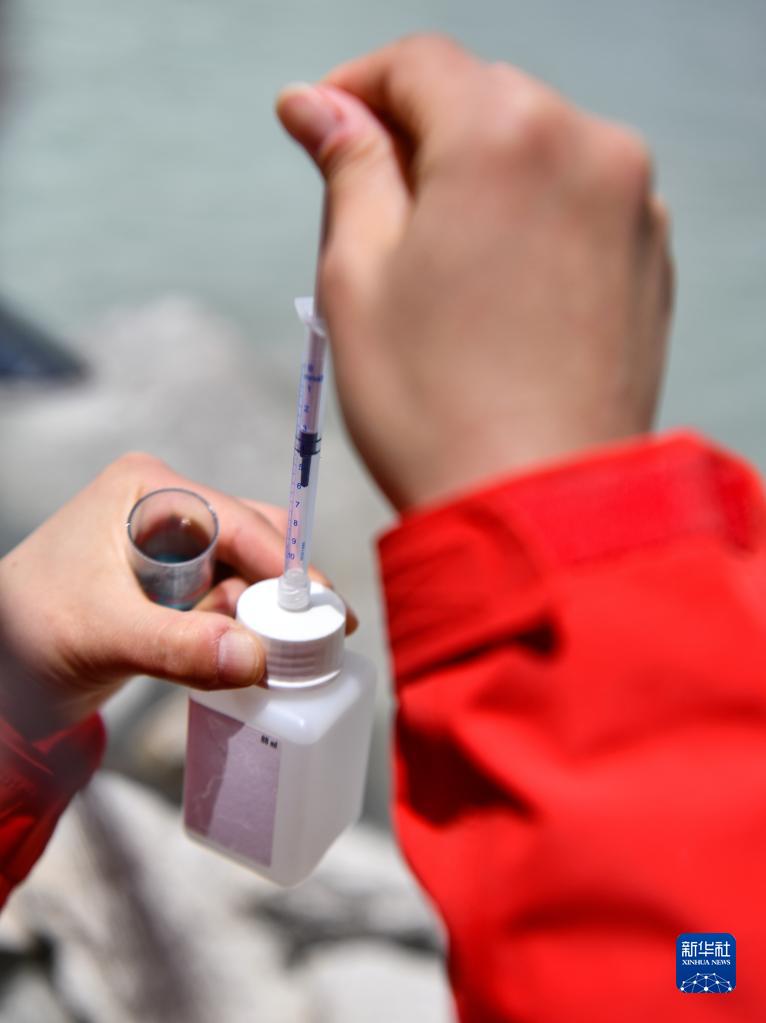 在珠峰登山大本營(yíng)附近,來(lái)自西藏大學(xué)生態(tài)環(huán)境學(xué)院的科考隊(duì)員在收集水生生物樣本(5月22日攝)。新華社記者 孫非 攝