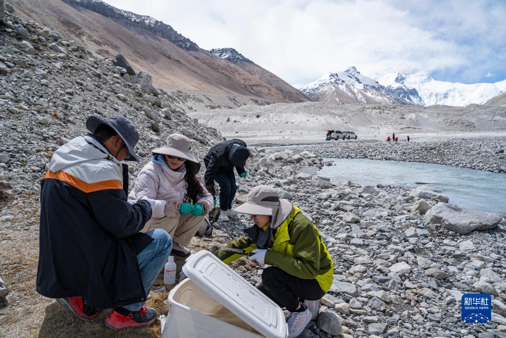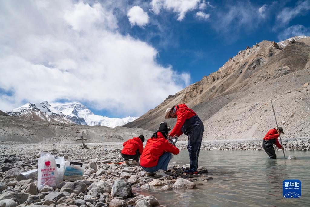 在珠峰登山大本營(yíng)附近,來(lái)自西藏大學(xué)生態(tài)環(huán)境學(xué)院的科考隊(duì)員在進(jìn)行水生態(tài)調(diào)查(5月22日攝)。新華社記者 孫非 攝
