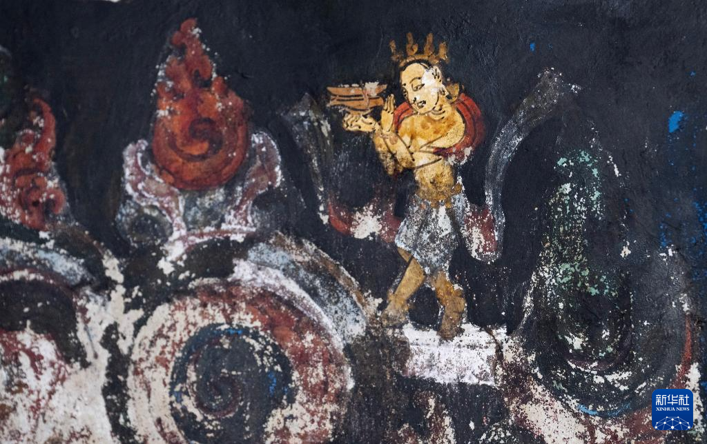 這是5月26日拍攝的皮央石窟壁畫中的長翅膀的人物造型。新華社記者 費茂華 攝