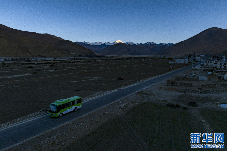 遠處的珠穆朗瑪峰與正在行駛的環保大巴(無人機照片)。新華網 旦增努布 攝
