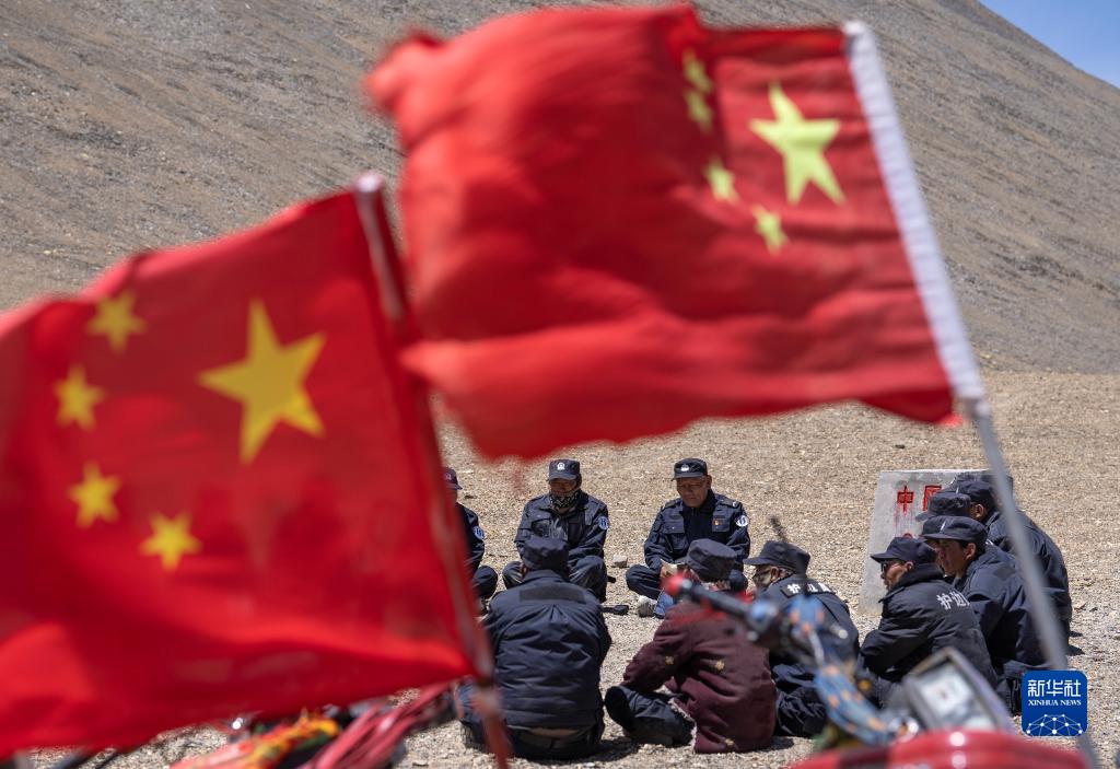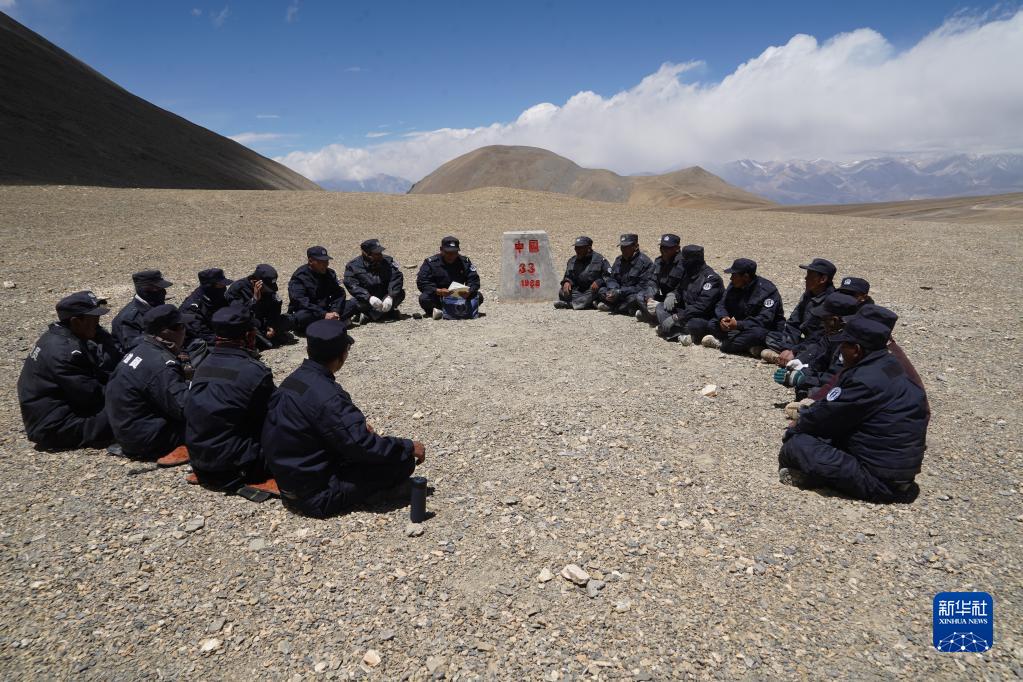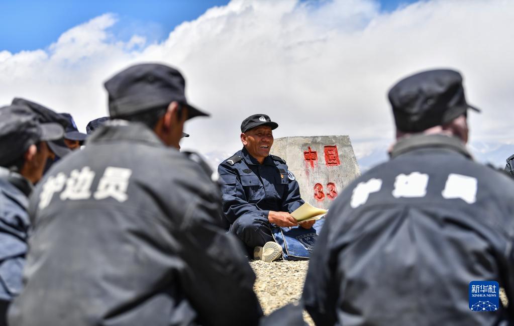 6月2日,在33號界樁處,護邊聯防隊在隊長石角(右二)的帶領下學習。新華社記者 晉美多吉 攝