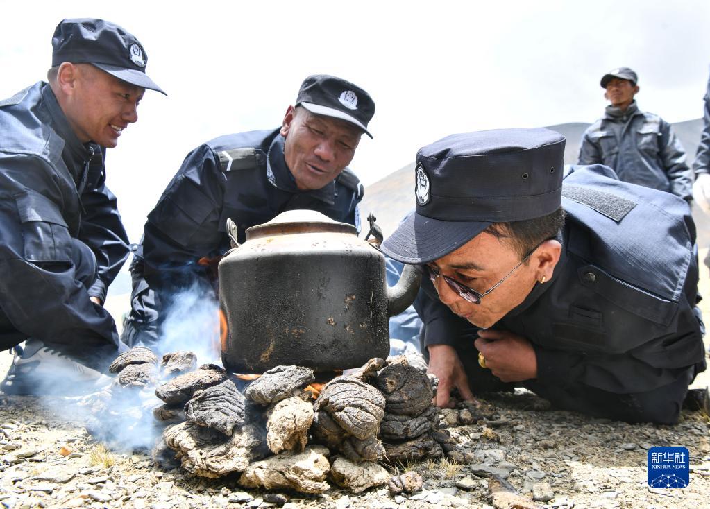 護邊聯防隊隊員在一塊空地上點燃牛糞,準備午餐(6月2日攝)。新華社記者 晉美多吉 攝