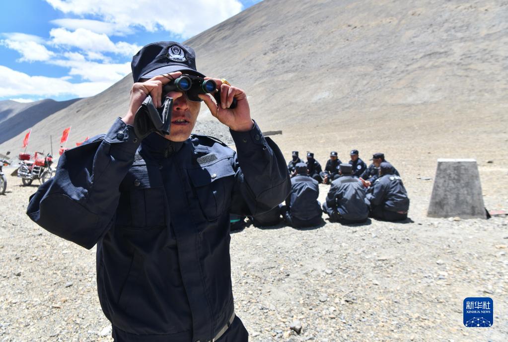 6月2日,在33號界樁處,一名護邊聯防隊隊員使用望遠鏡巡查。新華社記者 晉美多吉 攝