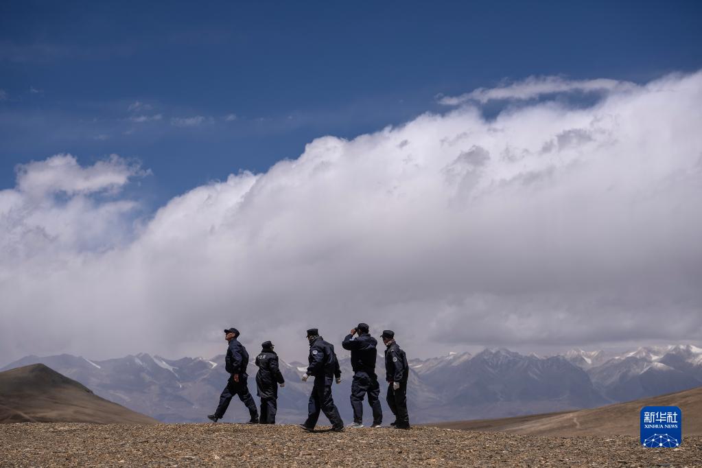 6月2日,石角(右二)帶領護邊聯防隊隊員在33號界樁附近巡邏。新華社記者 費茂華 攝